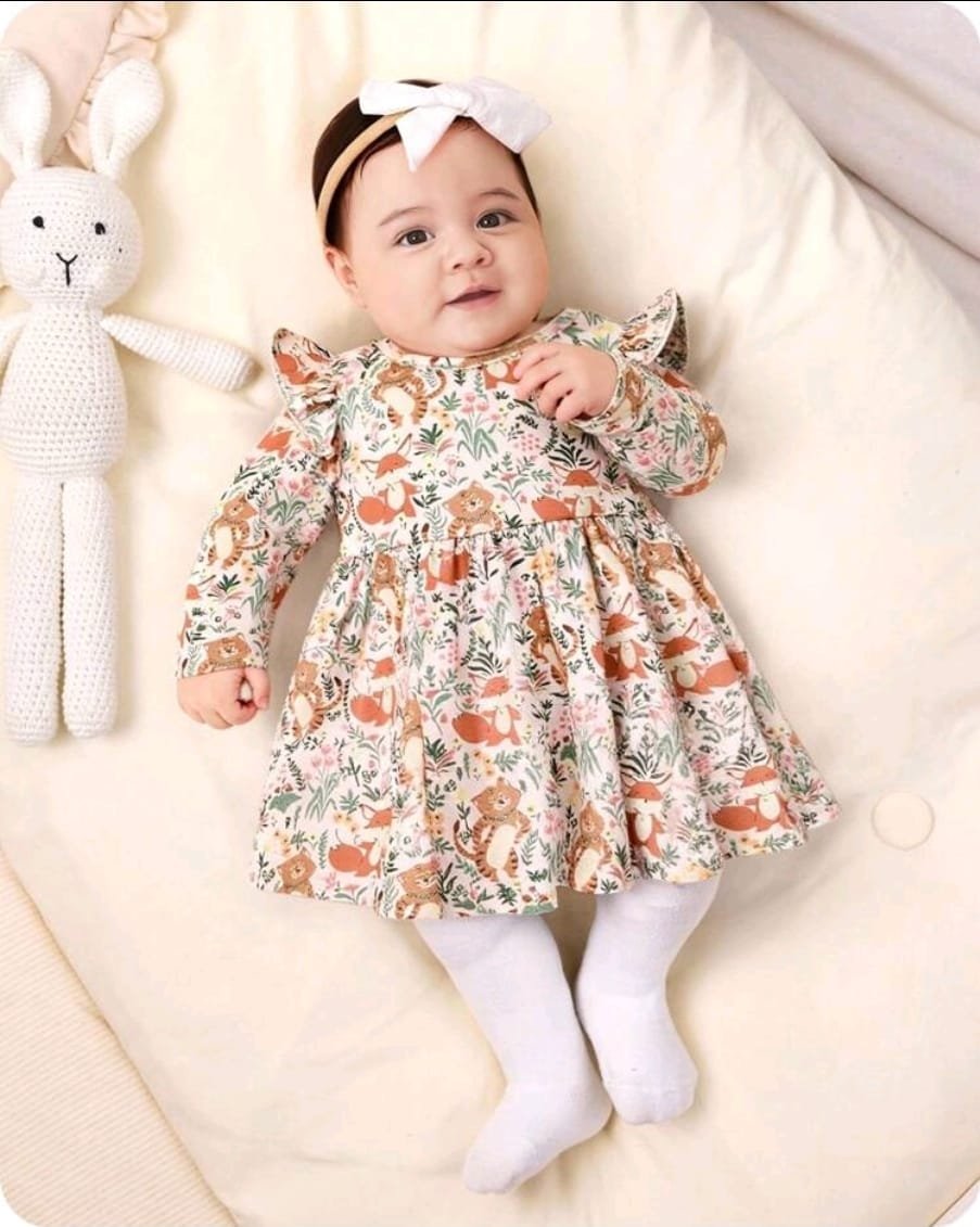 Vestido bebé 3-6 meses manga larga estampado bosque de animalitos fondo beige