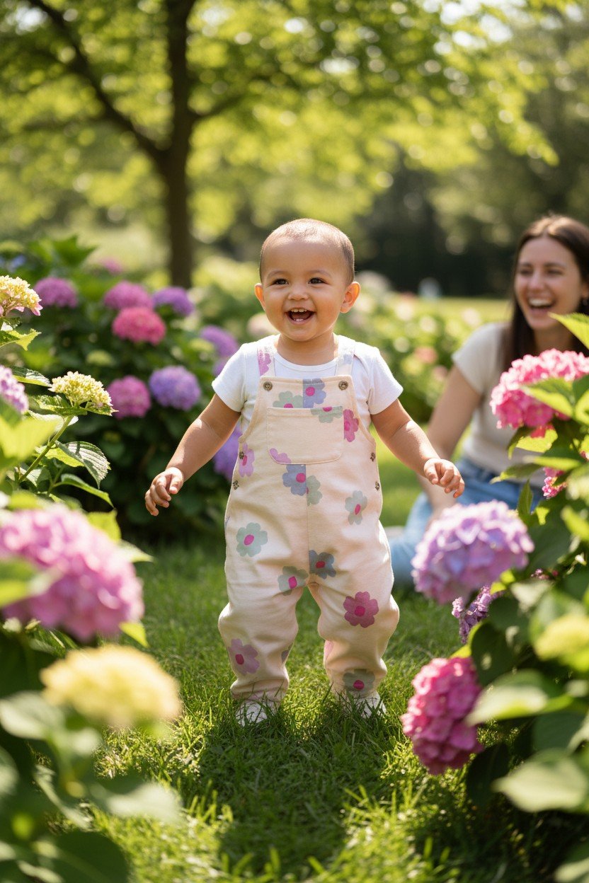 Overol largo niña 2-3 años fondo beige con flores pastel y tirantes regulables – León de María Boutique