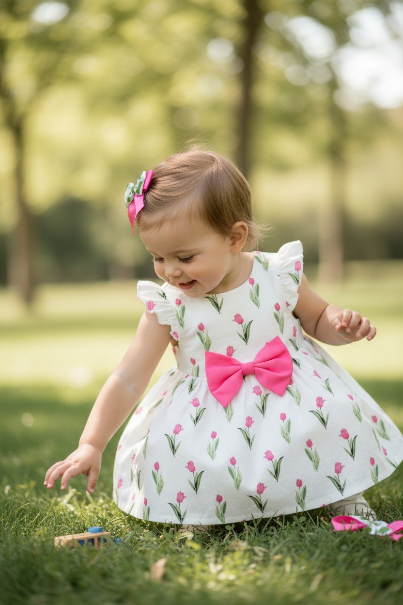 Vestido flores tulipán bebé 18-24 meses blanco con lazo rosa