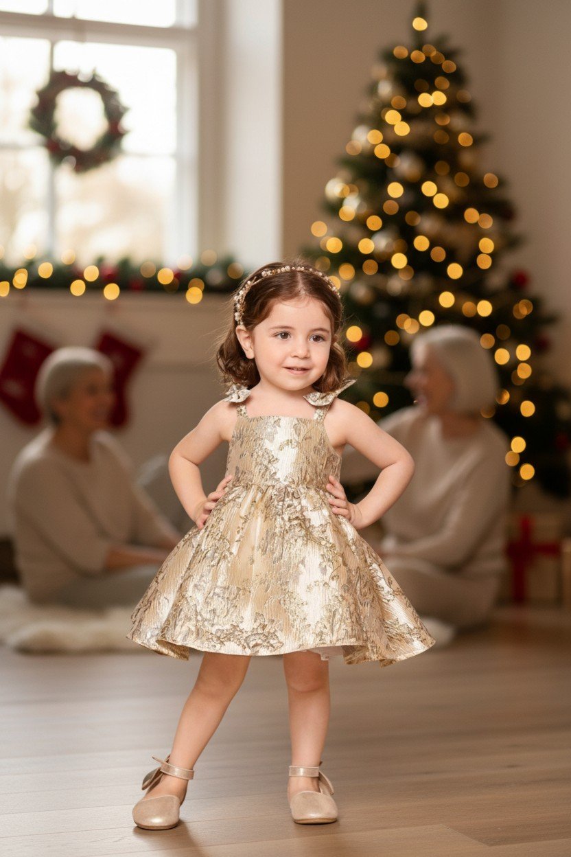 Vestido de fiesta niña 2-3 años dorado tipo brocado con falda amplia y brillo elegante – León de María Boutique