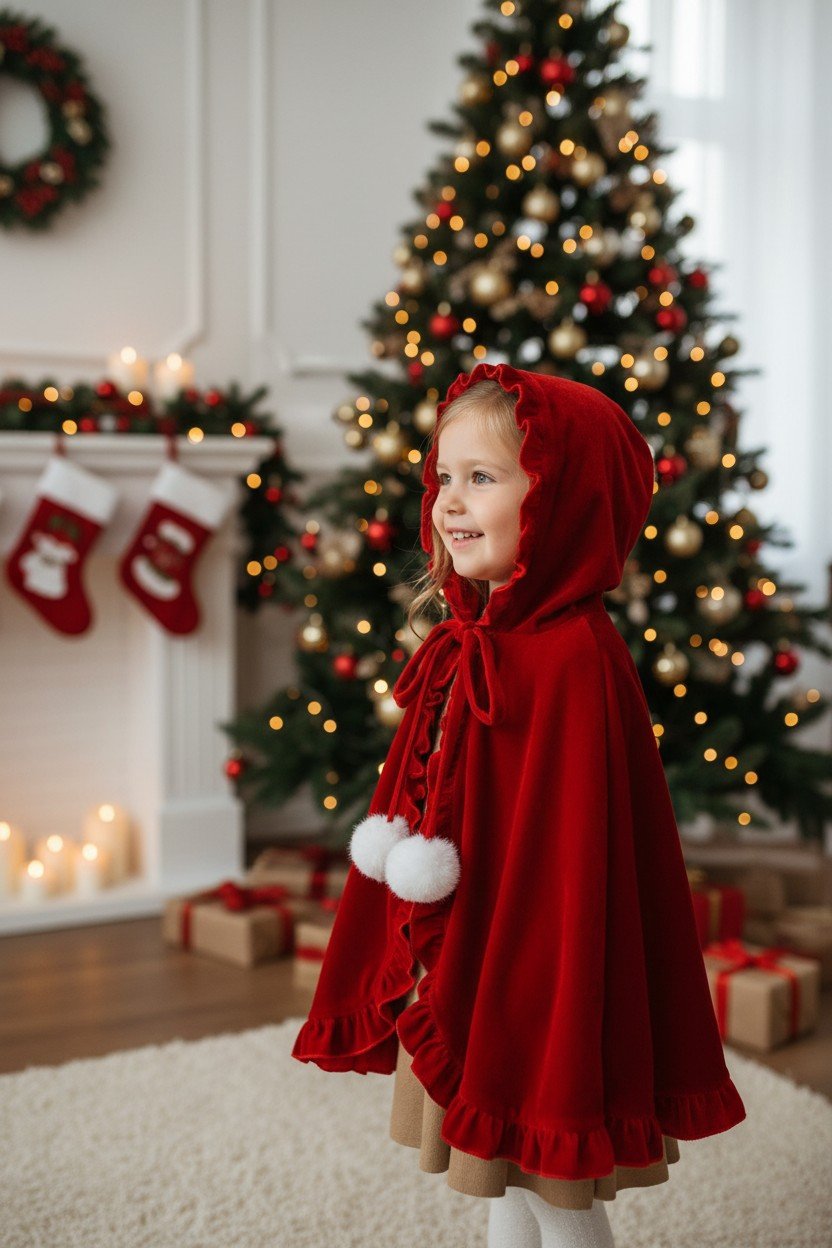 Capa capucha navideña niña terciopelo rojo con pompones blancos 5-6 años