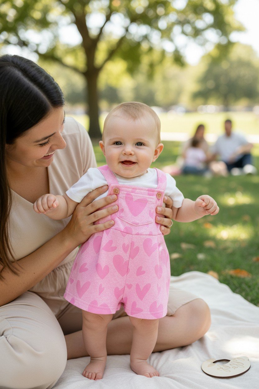 Overol corto bebé 3-6 meses rosa con tirantes y corazones
